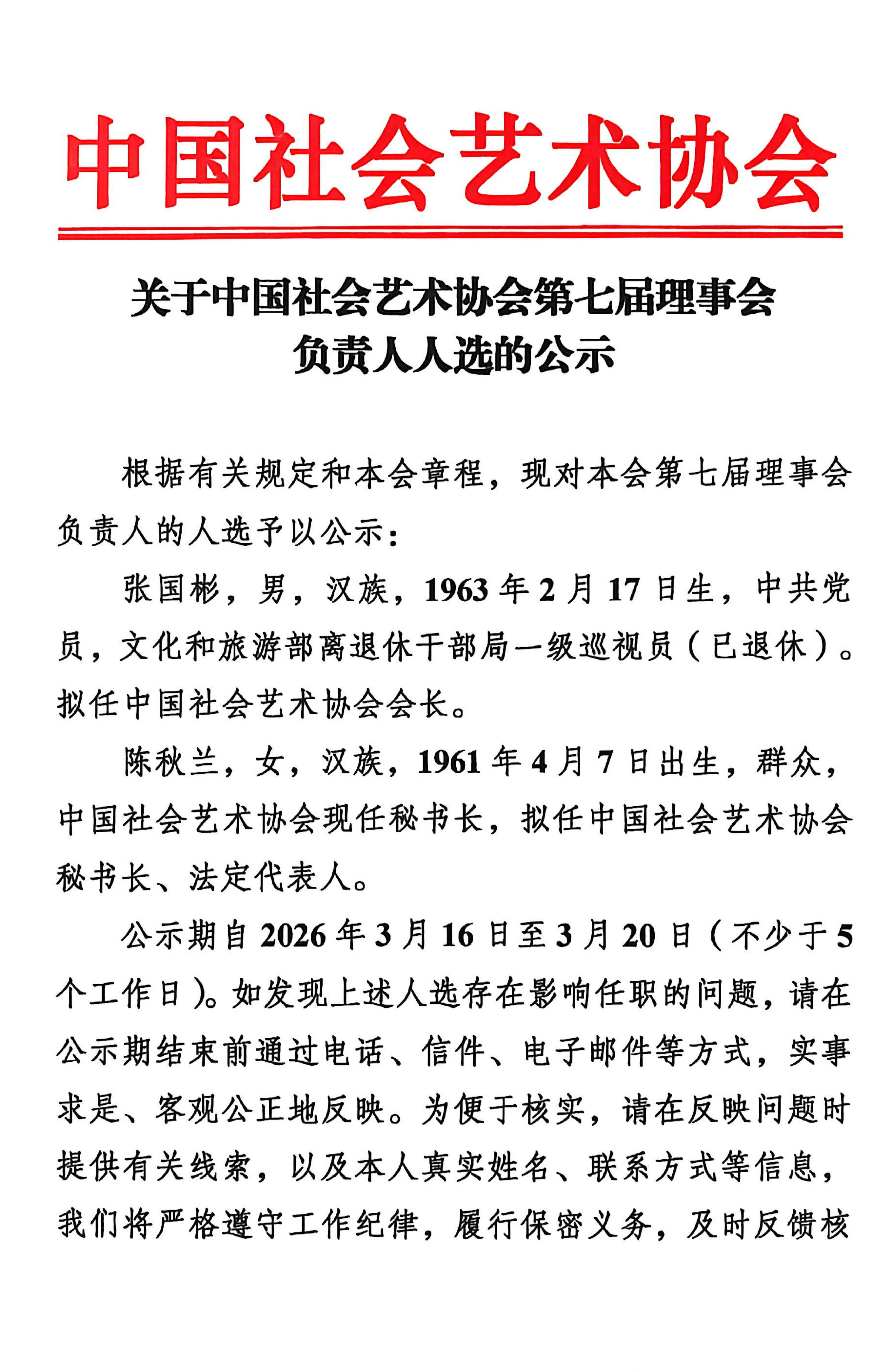 中国社会艺术协会负责人人选公示
